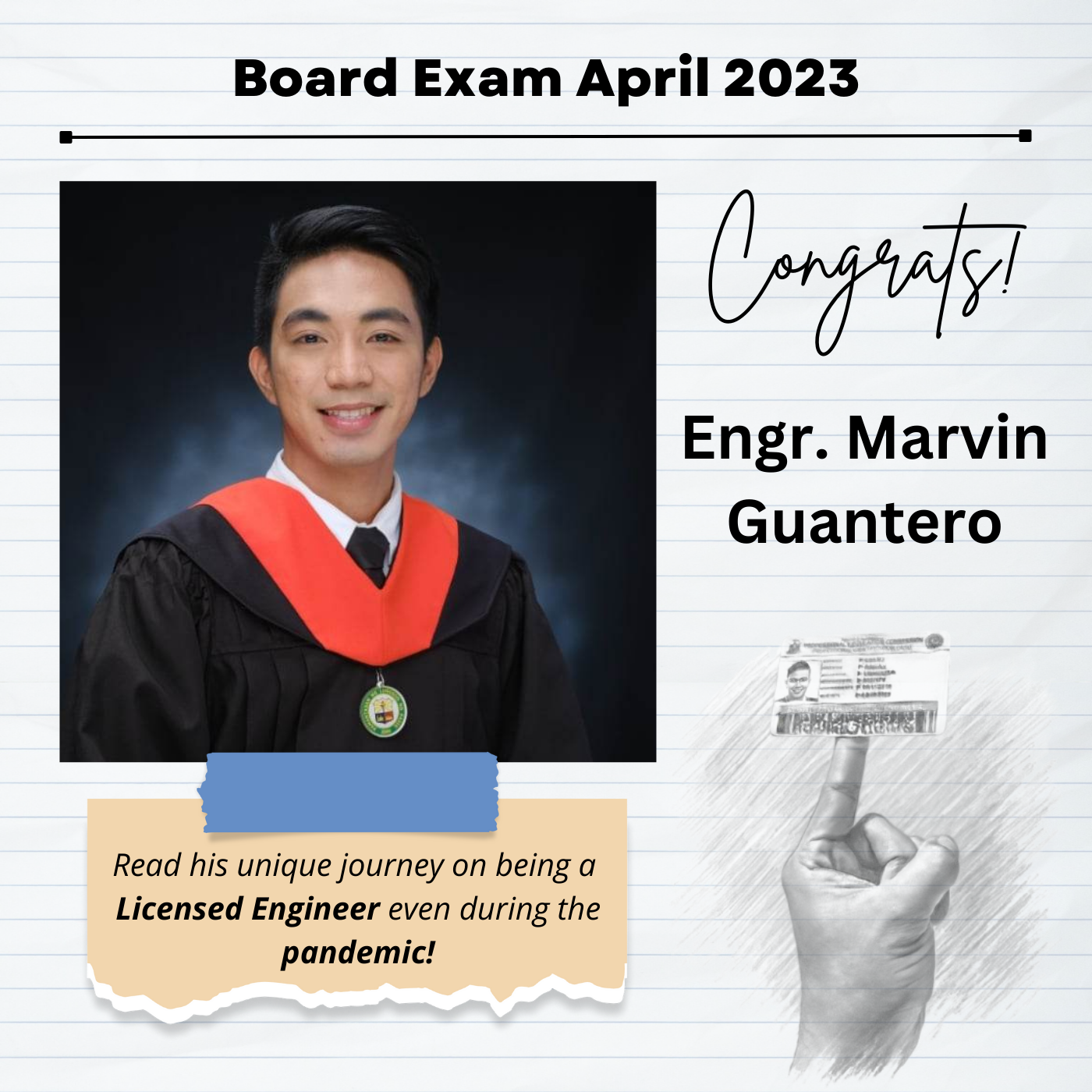 Sabi ko sa sarili ko Last na to! This time I will give my best! Give all na talaga! Focus lang sa Goal. Im indeed grateful because of hardwork, dedication, prayers and faith in God everything was paid off, Engineer na ako! All Honor and Glory to God!