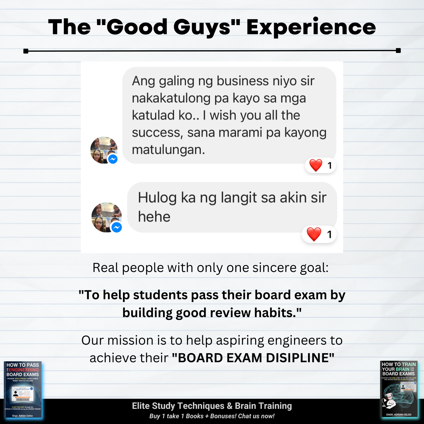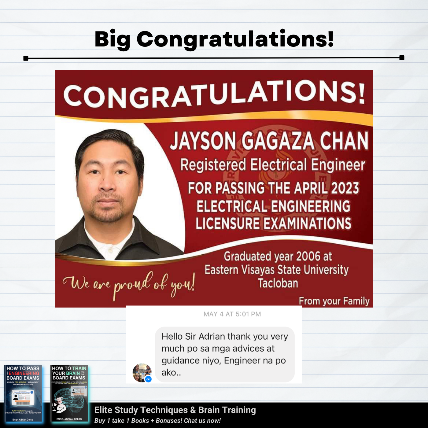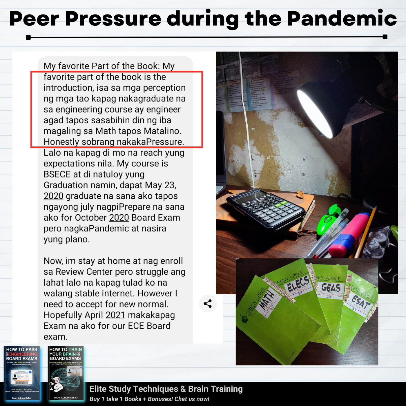 I graduated last 2020 po and Pandemic really affects me, hindi nakapag review during pandemic, na stock o napag iwanan na kumbaga. I already tried online review pero in my case di sya effective dahil sa bahay lang hirap makapag focus, madaming problems, struggle is real talaga kahit hindi pa 100% ready nag try ako. Kaya nag fail ako that time sobrang naapektuhan ako dahil sa failure ko na trigger ung anxiety and stress ko. But di ako tumigil para pa prove sa sarili ko at sa lahat na kaya ko, na maipapasa ko to! Dahil sa lahat ng emails nyo na boost ulit ung confidence ko, na motivate ako, at na inspire kaya't nung November 2023 sumubok nako ng Face to Face Refresher Course together with Online Review sa ES, and binabalik balikan ko yung books nyo as guide also para mas ma challenge ako mag solve/compute, mamaster basics at matuto.