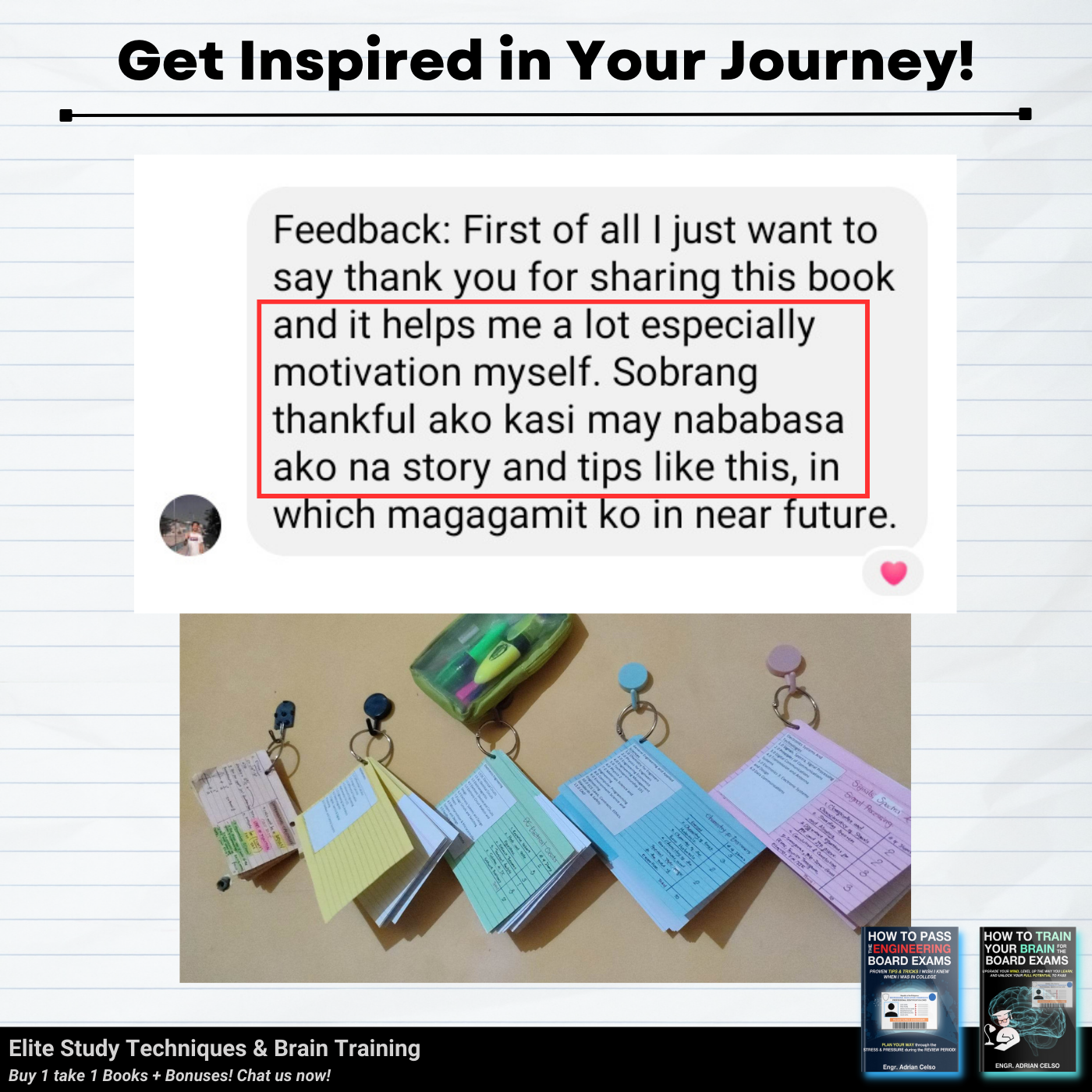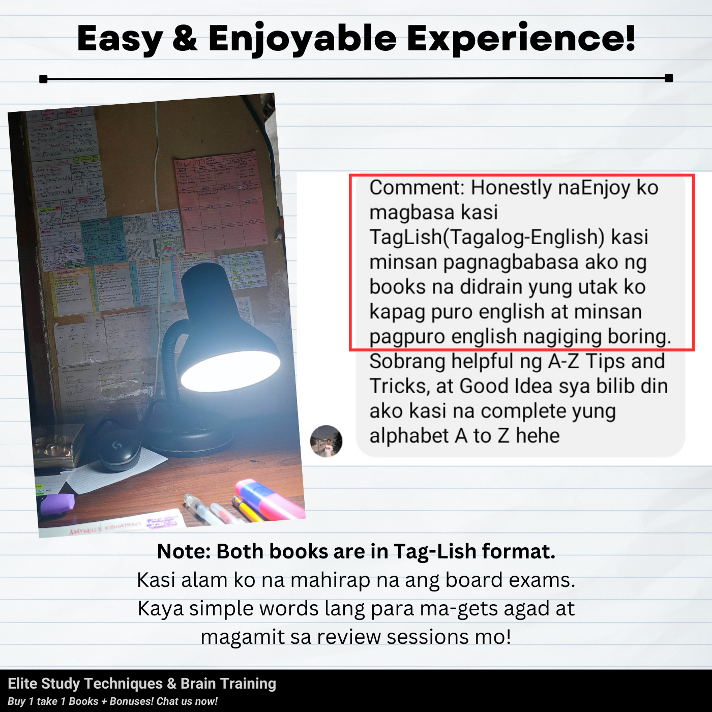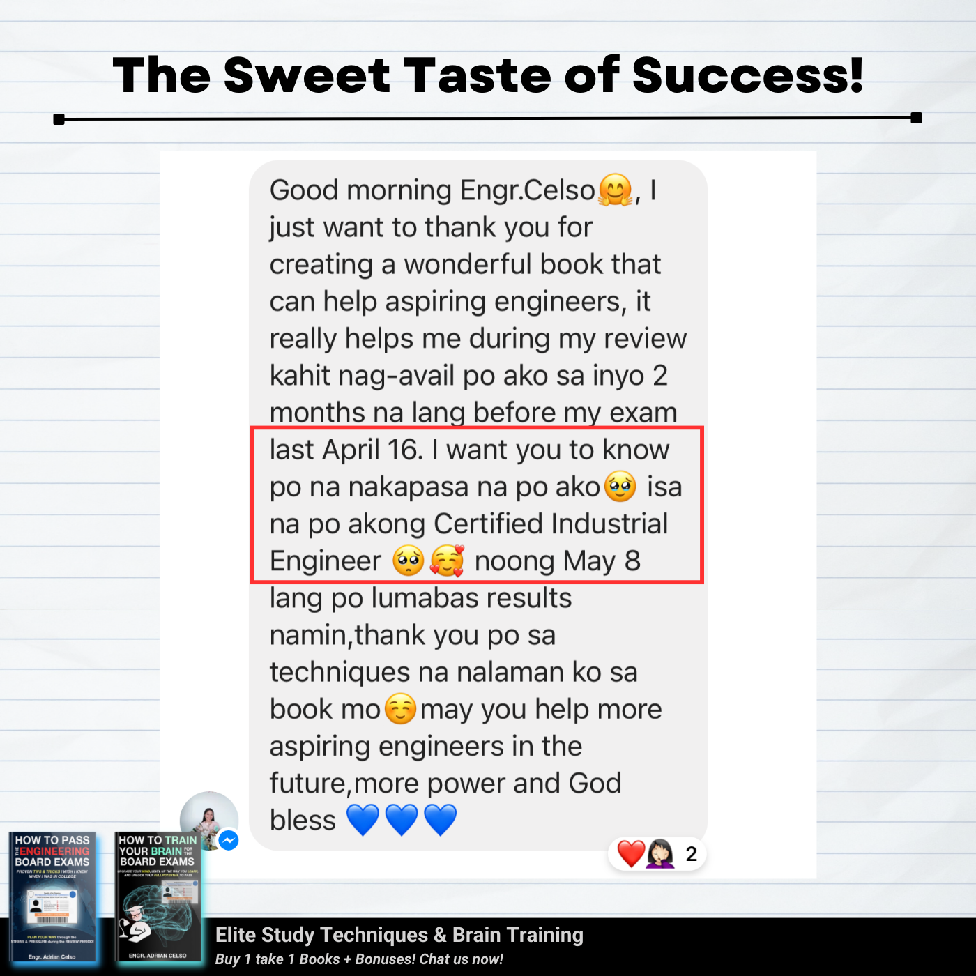 I graduated last 2020 po and Pandemic really affects me, hindi nakapag review during pandemic, na stock o napag iwanan na kumbaga. I already tried online review pero in my case di sya effective dahil sa bahay lang hirap makapag focus, madaming problems, struggle is real talaga kahit hindi pa 100% ready nag try ako. Kaya nag fail ako that time sobrang naapektuhan ako dahil sa failure ko na trigger ung anxiety and stress ko. But di ako tumigil para pa prove sa sarili ko at sa lahat na kaya ko, na maipapasa ko to! Dahil sa lahat ng emails nyo na boost ulit ung confidence ko, na motivate ako, at na inspire kaya't nung November 2023 sumubok nako ng Face to Face Refresher Course together with Online Review sa ES, and binabalik balikan ko yung books nyo as guide also para mas ma challenge ako mag solve/compute, mamaster basics at matuto.